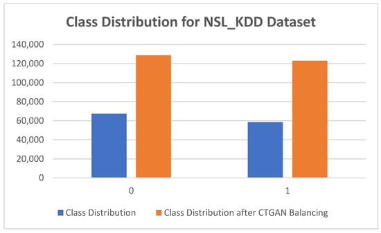 As we can see from Table 8 and Table 9, NSL_KDD and UNSW_NB15 data suffered from data unbalancing. Most models cannot accurately predict the minority class. To resolve this, CTGAN was used. The class distribution before data balancing comprised class 0 with 67,342 records and class 1 with 58,630 records in the NSL_KDD dataset. After the class balancing of the NSL_KDD data, the quantity of records in class 0 was 128,825 and class 1 contained 123,119 records, as depicted in Table 8 and Figure 2.