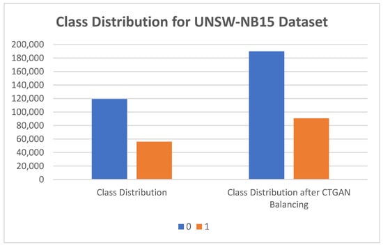 From Table 9 and Figure 3, we can see that the UNSW_NB15 dataset was imbalanced, as class 0 contained 119,341 records and class 1 had 5600 records. After applying CTGAN, class 0 contained 189,842 records and class 1 90,702 records.