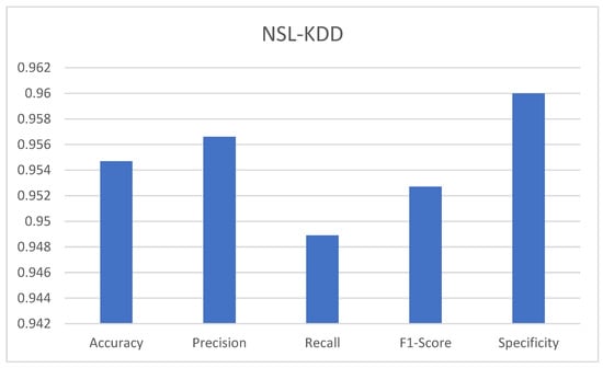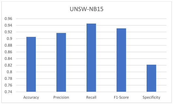 Figure 5 show the results obtained on the UNSW_NB15 dataset. The accuracy of 90.52% on the UNSW_NB15 dataset indicates that the model can make misclassifications around 9.48% of the time. The precision of 91.71% means that the model predicts an attack 91.71% of the time. The recall of 94.52% indicates the model predicted 94.52% of actual attacks correctly. The F1-score of 93.09% implies a good balance between precision and recall. The specificity of 82.16% means the model here identified 82.16% of normal records correctly.