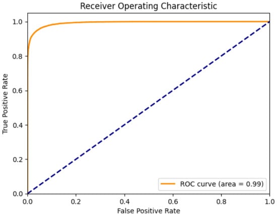 Figure 6 shows the ROC and AUC curve that is plotted, taking the false positive rate on the x-axis and the true positive rate on the y-axis. This curve conveys the effect of the model in predicting unseen records. The AUC curve is 0.99, which indicates that the model can successfully differentiate between normal and attack records. The graph shows a sharp early climb, which indicates the model has low false positives rates and high true positives rates.