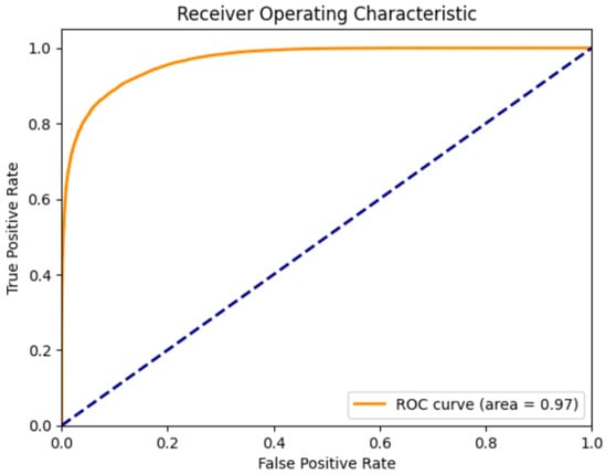 Similarly, Figure 7 shows the ROC and AUC curve for the UNSW_NB15 dataset, depicting that the false positive rate is low and the true positives rate is high, suggesting that the model can accurately predict test records as normal and malign. The AUC curve is 0.97.