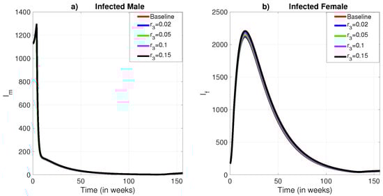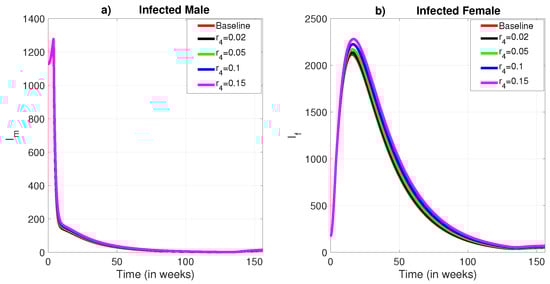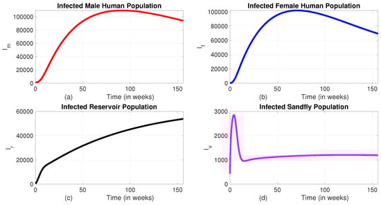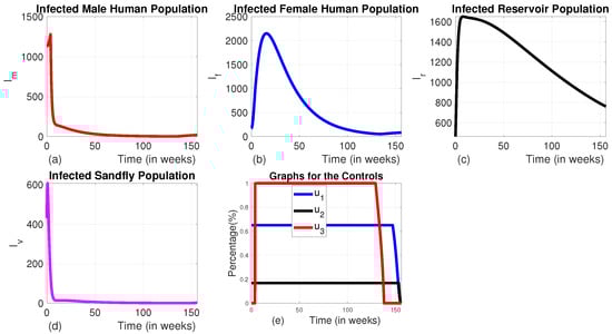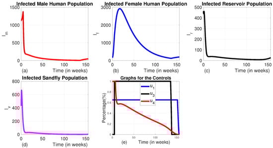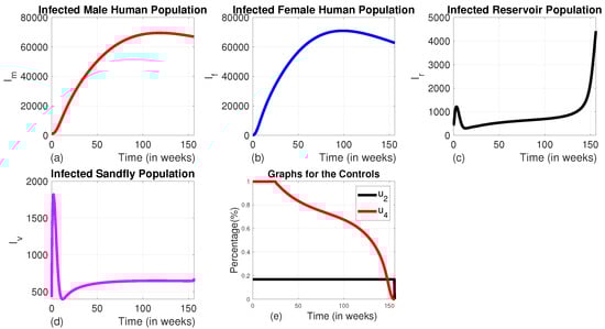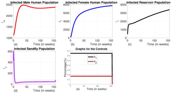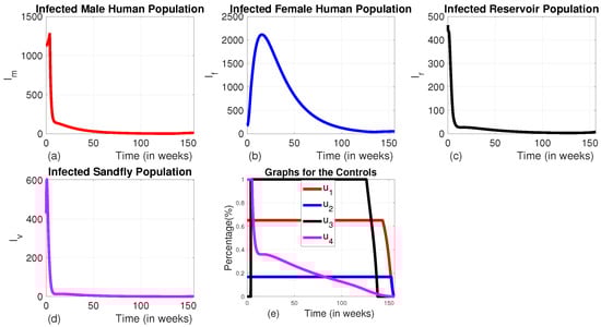 In this approach, we employed the combination of the three controls , , and without using infected animal culling. In this strategy, the number of infected reservoirs increases exponentially for the first 7.8 weeks and then begins to decrease. In contrast, the numbers of infected human males, human females, and sandflies decrease significantly (Figure 15a–d).