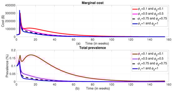The dynamics of the total prevalence of the disease and total intervention cost. (a) Total cost; (b) Total Prevalence.