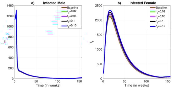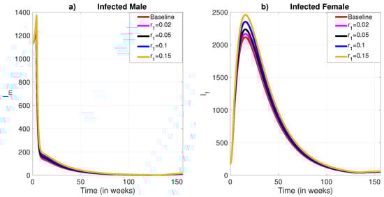 - Treating infected individuals: Treatment is an important method to recover from the disease. Treatment has an effective role in preventing and controlling the spreading of the disease. Proper and timely treatment can reduce the total prevalence of the disease. However, treatment alone will not be enough to truly halt the transmission of VL [32,33]. The efficacy of VL drugs varies from one endemic area to another. We assume that the efficacy of VL drug is . If and are the recovery rates of male and female human host, then the mathematical expression for the formulation of controls with an additional treatment effort () is given by: and . Where represents the natural recovery rate of the male human host, represents the natural recovery of female human hosts, and is a modification parameter, as stated before, with for every time .
