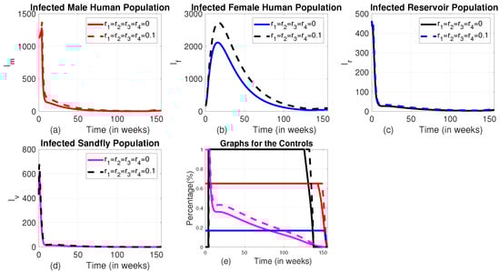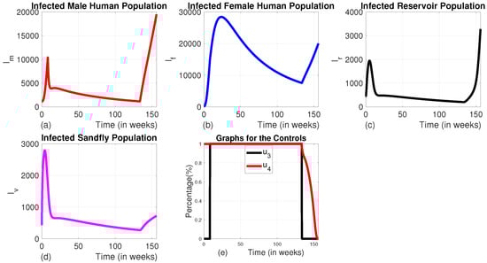 The dynamics of infected populations with Strategy F and the graph of controls profile. (a) The number of infected human males with Strategy E; (b) the number of infected human females with Strategy E; (c) the number of infected reservoirs with Strategy E; (d) the number of infected sandflies with Strategy E; and (e) the graph of controls profile.