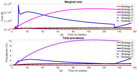 When all control measures are implemented, the total disease prevalence reaches its optimal level. As shown in Figure 16, Strategy F and Strategy E also prove to be effective in reducing the total prevalence, ranking just below Strategy A in terms of the level of total prevalence and their corresponding total cost. On the other hand, Strategy D does not seem to help in controlling the disease, as both the disease prevalence and associated costs increase during the planning period unlike the others. The cost-effectiveness of these strategies will be analyzed in the subsection below.