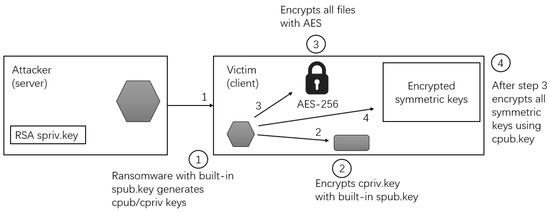 - The hybrid encryption using both server-side and client-side encryption in Figure 4 is a common technique employed by many ransomware attacks today. This method combines symmetric and asymmetric encryption and does not rely on an internet connection during the encryption process. In this approach, both the ransomware and the server generate an RSA key pair, consisting of a client public key (cpub.key), client private key (cpriv.key), server public key (spub.key), and server private key (spriv.key). During the attack, the following steps are typically taken: