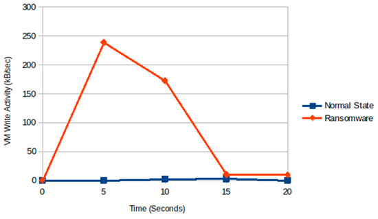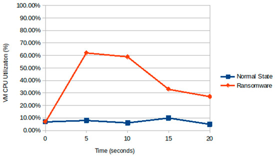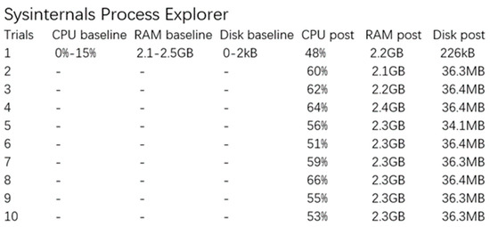 The baseline resource usage was determined from a snapshot of the VM before any ransomware was executed. Following the execution, the post-resource usage was determined by using an average of the resources used for 5 s after execution, except for the disk usage, which was collected based on the cumulative disk read/write activity.
