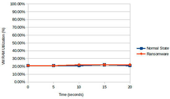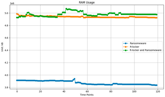 R-Locker exhibits substantial RAM consumption in both standalone and combined scenarios, indicating that its memory usage may be attributed to the maintenance of numerous trap files or the monitoring of system resources (see in Figure 15). In contrast, the ransomware primarily utilizes CPU and I/O operations, resulting in comparatively lower memory usage. The observed spikes in the CPU load during the combined scenario suggest that both R-Locker and the ransomware impose a significant computational burden on the virtual machine, especially when R-Locker actively responds to the ransomware’s encryption attempts by triggering trap files.