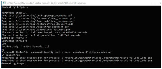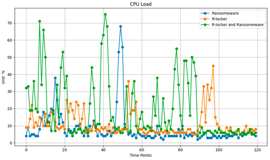 The observed peaks in the CPU load, reaching up to 75%, indicate that R-Locker and the ransomware are contending for CPU resources, with the ransomware attempting encryption while R-Locker sets up and monitors trap files (see in Figure 14). This competition likely contributes to increased processing demands. The ransomware exhibits moderate CPU usage, predominantly below 30%, corresponding to its encryption operations, with occasional spikes reaching up to 40%. R-Locker also experiences CPU load spikes up to 50%, potentially due to its activities in monitoring the ransomware and triggering trap files to thwart encryption attempts.