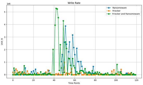 The elevated write rates observed in the combined scenario suggest significant disk activity, likely resulting from the ransomware’s attempts to encrypt the decoy trap files generated by R-Locker (see in Figure 16). This behavior indicates that R-Locker effectively deceives the ransomware into expending resources on encrypting non-essential files rather than actual data. In contrast, the lower write rate observed when R-Locker operates independently implies that its primary function is setting up these trap files without engaging in substantial I/O activity, except when actively responding to an attack.