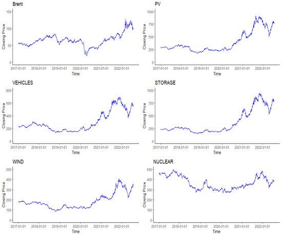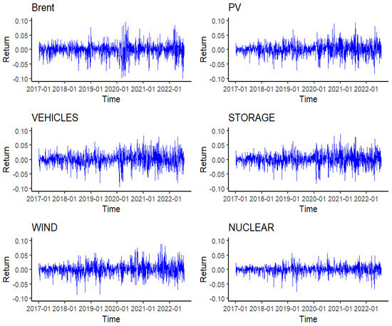 The Brent oil market launched by the Intercontinental Exchange (ICE) of the United Kingdom is notable for its breadth and stability. In this empirical study, we considered the daily futures price of Brent crude oil (Brent) to represent the oil market. The CSI New Energy Index was selected to represent the Chinese new energy market, reflecting the overall performance of listed companies in the new energy industry. The companies corresponding to the CSI New Energy Index constituents are divided into segmented industries according to the Shenwan Industry Classification. Five of the most high-frequency industries, i.e., photovoltaic, energy storage, new energy vehicles, wind power, and nuclear power industries, were selected as typical new energy industries for subsequent research and analysis from 1 January 2017 to 26 July 2022. The closing prices of the CSI PV Index (PV), the CSI New Energy Vehicle Index (VEHICLES), the CSI Energy Storage Index (STORAGE), the CSI Wind Power Index (WIND), and the CSI Nuclear Power Index (NUCLEAR) are denoted to represent the above five industry stock markets. All the above data were obtained from Wind Information Co., Ltd. (Shanghai, China). The data of Chinese new-energy-related stock markets were converted to US dollar prices based on spot rates. After excluding non-trading days, 1341 sets of valid data were retained. The long-term trends of the different CSI Index price indices and the Brent oil price can be seen in Figure 1. Figure 2 plots the returns, which are given as , and denotes the closing price of the financial market.