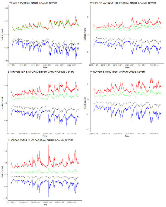Based on the R-vine copula model, according to the method described in Section 3.2, we calculated , , and to measure the RSE of the Brent oil market on the Chinese new energy industry stock markets. Figure 4 illustrates the variations of VaR and CoVaR for the five stock markets at a 95% confidence level.