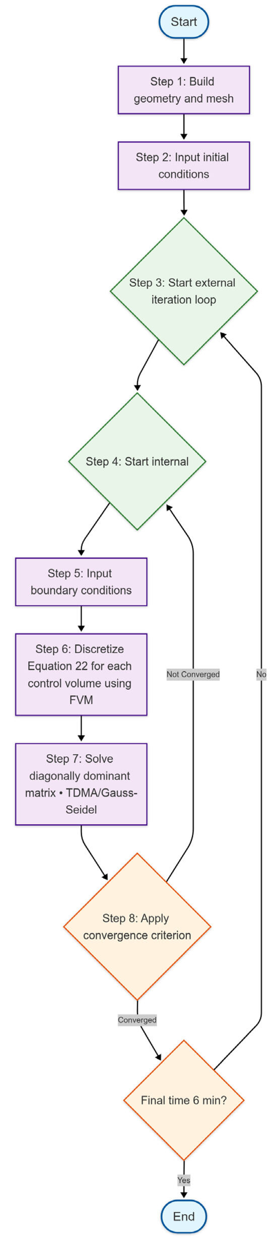 - Patankar, S.V. Computational of Conduction and Duct Flow Heat Transfer; CRC: Boca Raton, FL, USA; Taylor & Francis Group: Abingdon, UK, 1991. [Google Scholar]