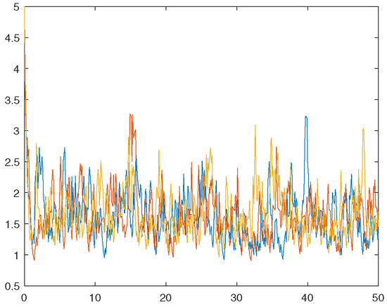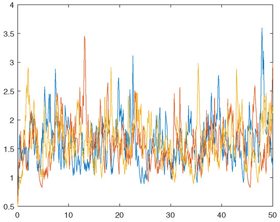 We will use the Euler–Maruyama method to iteration [22], in which the time interval and step length . Firstly, we present three sample paths of the solution to verify the boundedness of in time. Hence, we take the initial data in Figure 1 and in Figure 2, respectively.