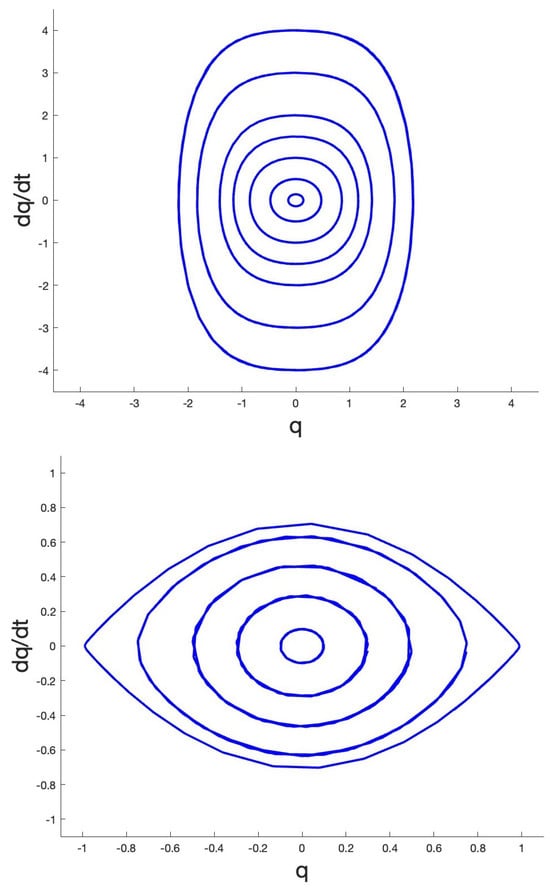 Choosing implies that we have no saddle equilibrium in the conservative oscillator (). Choosing negative c would change the dynamics for larger values of the initial energy; in Figure 1, we illustrate this for , where all solutions are periodic, and , producing saddles in the phase plane.