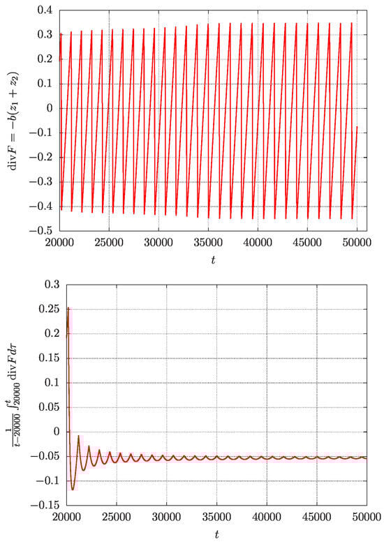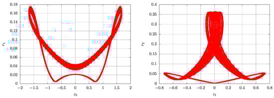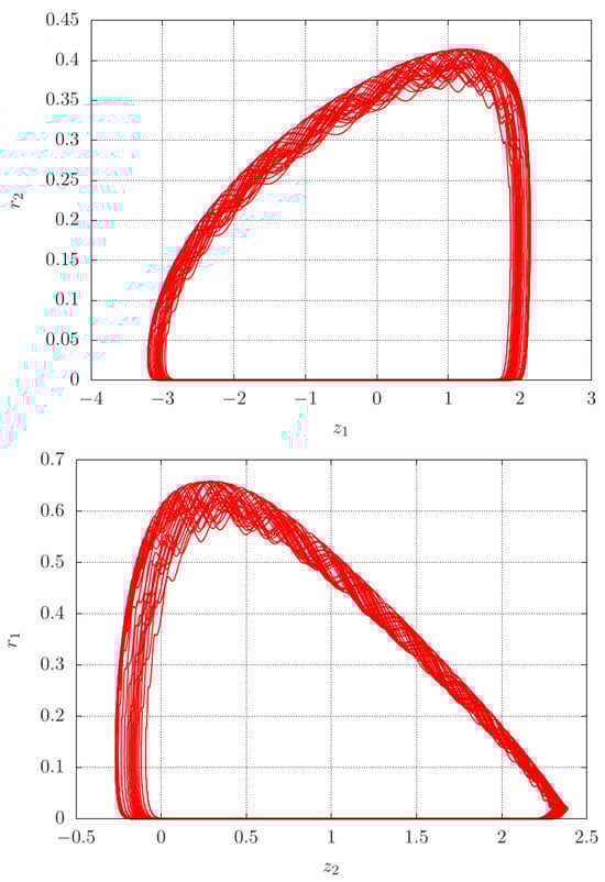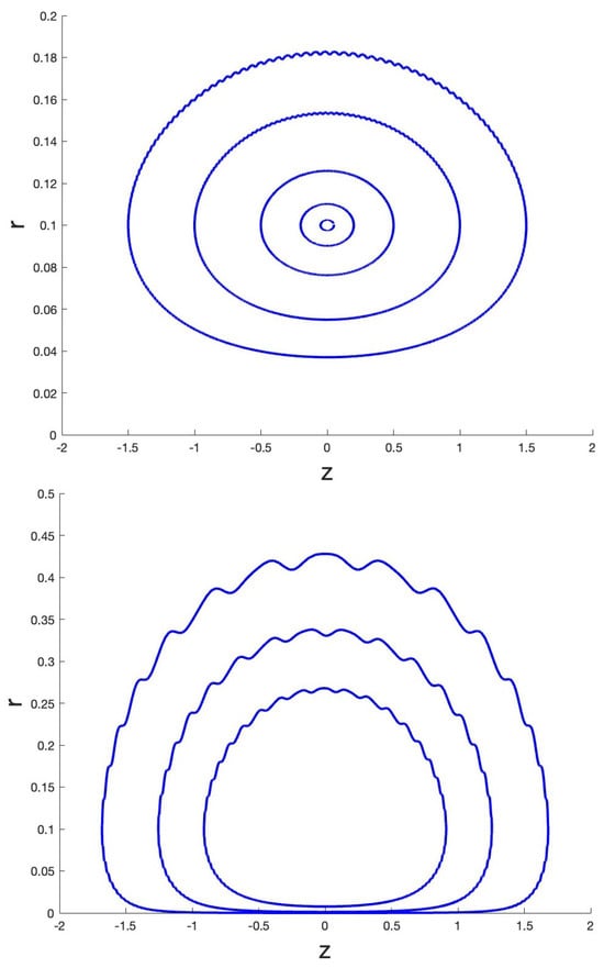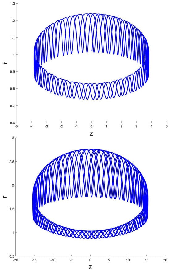 The dynamics near the z axis, as shown in Figure 2, were obtained with parameter a . System (3) was designed to find a periodic solution by averaging close to the z axis. The system can also be interpreted as a slow–fast system with fast variables and slow variable z. According to the theory of slow–fast systems, see [23] and further references therein, a slow manifold will be given by (the z axis). The slow manifold is not normally hyperbolic, so the attraction or repelling is not necessarily exponential, but the explicit form makes characterisation easy. If we start with a positive value of and with , the solution will move closer to the slow manifold. As long as , will decrease because of dissipation. At time , and the term will produce excitation for . The slow manifold becomes unstable, but as the solutions are very close to the z axis, they will persist for some time in motion near the z axis; this is the canard phenomenon. The symmetry of the equations causes the jump-off point of the solutions to mirror the approach point; see Figure 2 (lower) again.
