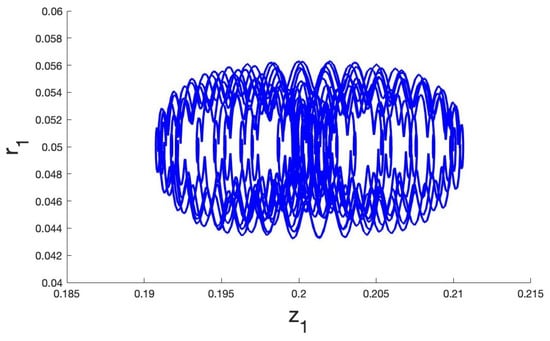 The canard character of the flow is shown in Figure 19, where the projected dynamics suggests a flattened torus; the variable takes negative and positive values, while takes mostly positive ones producing both attraction and repelling.
