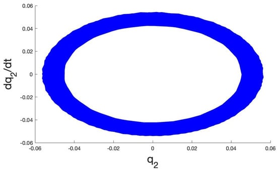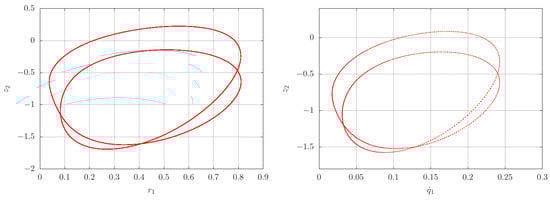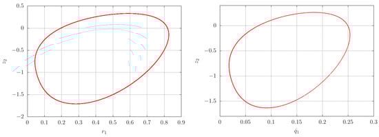 We have as a critical point of the averaged system (9). The determinant in the critical point does not vanish for , so the approximation (8) corresponds with an existing periodic solution of the original system that is -periodic in s. The eigenvalues in the critical point are , so the periodic solution is with the first approximation neutrally stable. A second-order approximation in does not change the picture qualitatively, as the time reversibility plays an essential role in producing an infinite set of KAM tori; see Figure 2. In these cases, alternates around . The periodic solution obtained above serves as an organising centre. The solutions are symmetric with respect to as predicted.