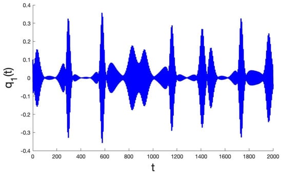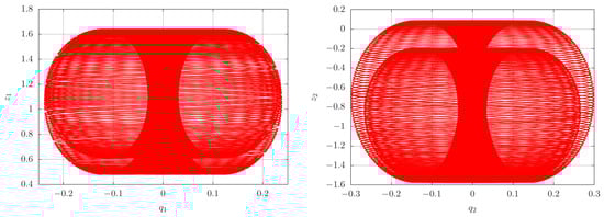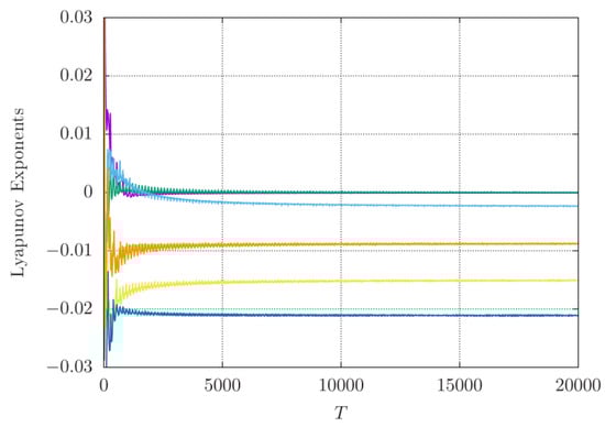 Consider the dynamics when leaving the region of small oscillations. In the case of friction parameter b and interaction parameter still being small, we consider with interactions of quasi-periodic solutions. Selecting initial conditions for the coordinates and parameters , we obtain chaotic solutions; see Figure 22, where we have chosen . The Lyapunov exponents for the case are depicted in Figure 23. As usual ; varying c changes the dynamics but keeps chaos. The exponents are , The dynamics turn out to be hyperchaotic with two positive exponents.
