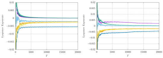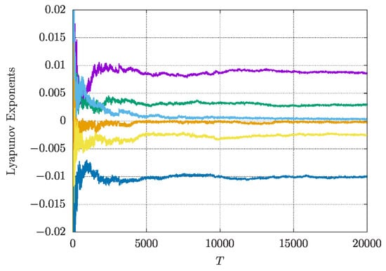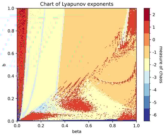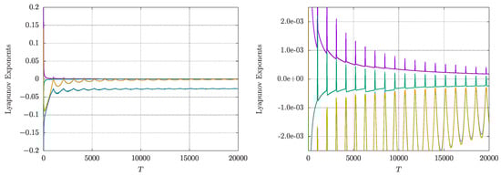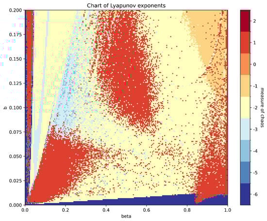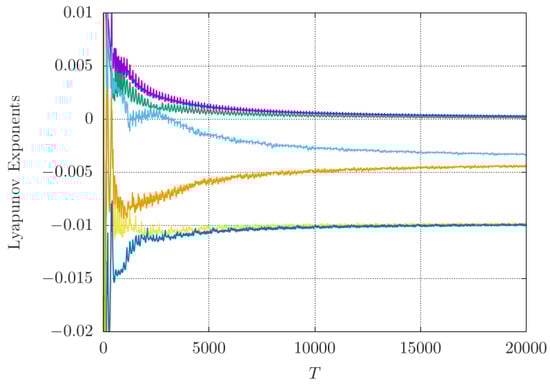 As in most applications, the dissipation has to be fairly small; we zoom in for . We obtained and show the Lyapunov exponents in Figure 25.
