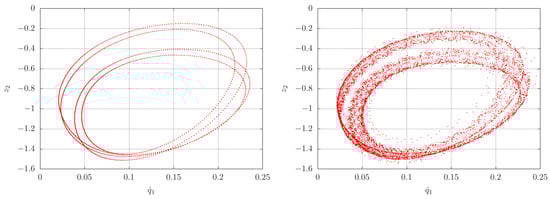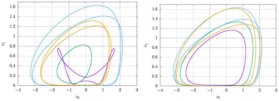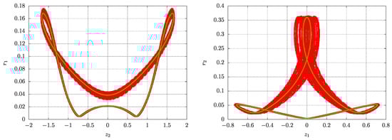 Dynamics near the z axis based on system (3). Left side shows the closed curves in a diagram describing the tori around the periodic solution approximated by Equation (7). The initial conditions are with parameters , . Right canard behaviour near the z axis with initial conditions , with parameters is shown.