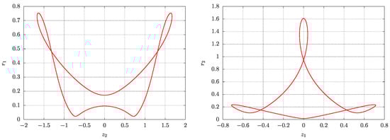 Dynamics based on system (A1) for with projections and for 10,000 time steps. The initial conditions are taken near the critical point of case 1 in vector form with for the parameters . The components tend to the limiting values of case 2 (combination angles ).