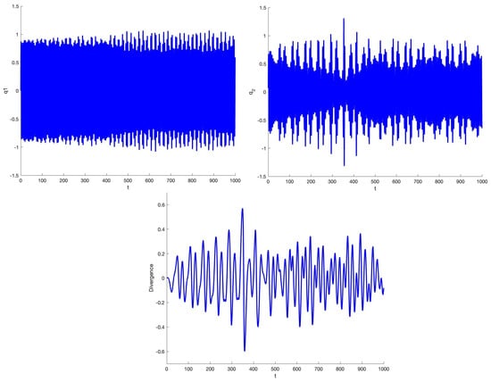 Time series of 2 quasi-periodic oscillations based on Equation (17) with and with parameters . Top left side shows , top right shows , and figure below shows the strongly fluctuating divergence of the flow.