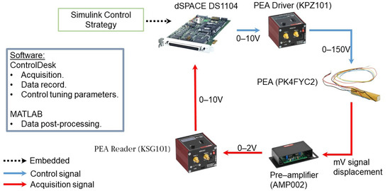 Because the driving and acquisition signals are in the range of 0–10 V, a DS1104 manufactured by dSPACE GmbH (Paderborn, Germany) was used for these purposes. This is a controller board used for research and development aimed at rapid control prototyping. It has several input/output interfaces with a real-time processor that is able to reach up to 250 MHz. Additionally, a major capability is the real time interface (RTI), which helps in the design of controllers in Simulink through blocks for input/output configuration.