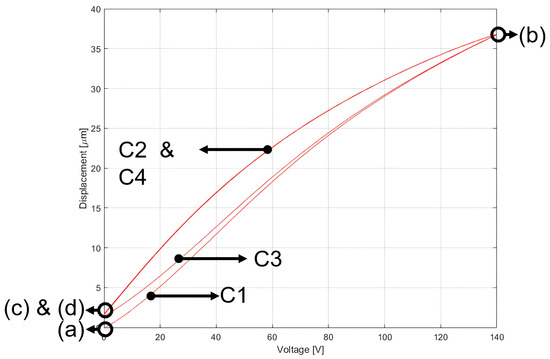 From the previous description and Figure 2, further details can be highlighted: (1) curve C1 was generated for the first half period from an initial calibration, which means that this path is unique for the first time; (2) the following cycles recurred between C2 and C3, which implies that the hysteresis takes place in an unique path provided that the voltage, signal type and period are constant; (3) points (a) and (c) are drift apart as a consequence of the creep effect [79]; (4) the hysteresis of the PEA used is asymmetric, which is a complex challenge in the design of advanced controllers.