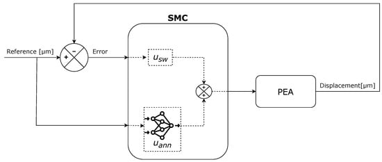 The general command expression of each control, according to the design proceedings of SMCs, is a split of two terms as shown in Equation (3): equivalent and switching (). Though the first one mentioned is usually achieved using a mathematical model of the system, an ANN was used in this case (). This is mainly because of the issues mentioned in Section 1 about hysteresis models. On the other hand, the switching term ensures the robustness of the scheme by means of the sliding behavior [86].
