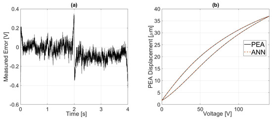 Figure 5 shows a test made in which the experimental results were contrasted against the output of the trained TDNN during a period of 4 s. The objective of this attempt was to evaluate the performance of the ANN as an inverse hysteresis model for the proposed controllers. Therefore, Figure 5a shows an error that averages around 0 V in the ascending curve until the first slope changes at 2 s. Surrounding this point, the error increases its amplitude to around 0.6 V, which means less than 1% of difference to the expected value, which is a satisfactory range.