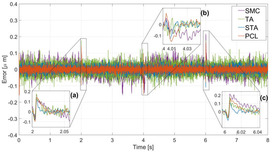 Figure 6 demonstrates the acquired error during 8s, which is two triangular wave cycles. This reference was selected since it allows us to observe the performance of the controllers in the peaks of the hysteresis curve where the ANN showed the worst errors. Graphically, the main spots to be analyzed are the slope changes (2 s, 4 s, and 6 s), and a general conclusion can be achieved through numerical tools to grant a better verdict. Figure 6a displays the error in the first slope switch from rising to decreasing voltage in a short time range. It can be seen that all the controllers behave similarly in the change since an overshoot is generated. In this sense, the strategy that provided the higher overshoot has been TA (0.17 V) whereas the lowest one was STA (0.12 V), which also gave the best settling time (near 0.018 s). It can also be seen that after 2 s, TA showed more variation in the amplitude than the conventional SMC, expected to be the algorithm with more chattering.