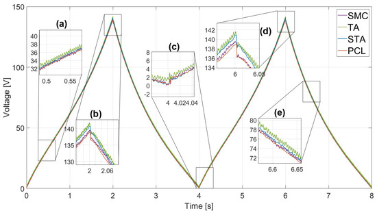 At the lower converging point in 4 s (shown in Figure 6b), the performance of the controllers is rather different, though the TA still has enough variation. The PCL algorithm seems to provide the highest undershoot because the amplitude was around 0.25 V in contrast to the 0.08 V from STA, which specified the lowest value. The settling time has also achieved the best value with STA, which has been around 0.016 s.