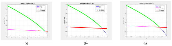 The positive part of the graph of is in green and the negative part of the graph of is in red for: (a) ; (b) ; (c) .