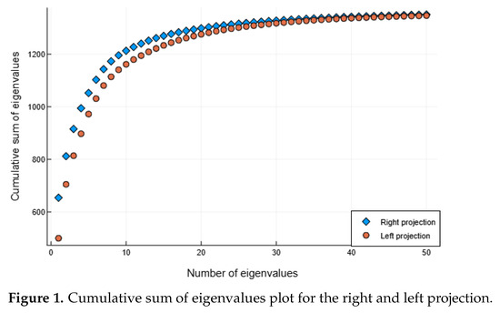 The eigenvectors of the selected matrix corresponding to the first ℓ eigenvalues form the columns of the matrix . If the matrix is selected, the projections will take the form given in Equation (5). We call this the right projection. Conversely, if the matrix is chosen, the projections will be calculated as