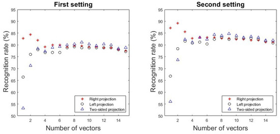 Recognition rate depending on the number of vectors in the first and second setting for the right, left, and two-sided projection.
