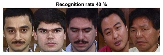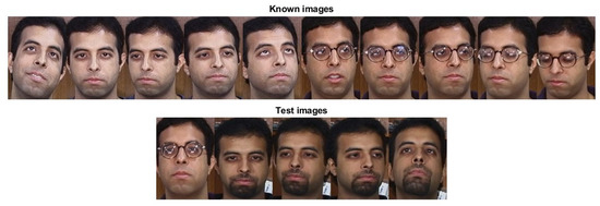 Since we used five test images per person, our algorithm could produce individual recognition rates of , , , , , and . The majority of individuals (28 out of 50) were correctly recognized with a recognition rate. Only one person had a recognition rate of . Figure 3 presents this individual’s known and test images. Our algorithm recognized the person only in the first test image. A possible explanation for this low recognition rate is the difference in facial hair between the known and test images. To address this, we made a small adjustment; we swapped the third known image with the fourth test image, ensuring that at least one image with a beard was included in the known set. This modification increased the recognition rate for this individual from to and improved the overall success rate to .