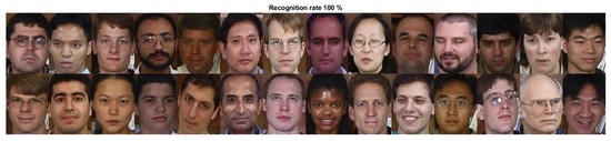 Following the projection selection strategy, presented in Section 4.1, we constructed covariance matrices to obtain left and right projection vectors. Using the Jacobi algorithm, we computed the eigenvalues and eigenvectors of these matrices. The cumulative sums of the first 50 values are presented in Figure 1. From the plot, it is evident that the right projection achieves higher variance. Additionally, we observe that it is unnecessary to take ℓ larger than 15. By varying the parameter ℓ from 1 to 15, we found that the best performance was achieved at . In this case, the total recognition rate (calculated as the number of correctly recognized images divided by the total number of images) was . The recognition rates for other parameter values ℓ will be presented later in Figure 2. Regarding the execution time of the algorithm, the generation of the covariance matrix for the known images required 10.5 s. Computing its eigenvalues using the Jacobi method required 0.4 s, and projecting all known images required 0.15 s. These steps were performed only once for the entire dataset of 500 known images. After this initial processing, the recognition phase was significantly faster: just 1.1 s for all 250 individuals.