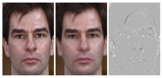 After a detailed analysis of projection selection, as well as the ℓ parameter, we compared our method with quaternion PCA and Robust PCA (described in Section 4.4). We created two versions of the Robust PCA algorithm. Both begin by performing a low-rank plus sparse decomposition on the entire set of images. In the first version, referred to as Robust PCA, no projections are applied. Instead, recognition is based on directly comparing the low-rank components of the images. The person on the test image is identified by evaluating the norms of the differences between its low-rank component and those of the known images. In the second version (referred to as Robust PCA + Proposed method), we integrated our method with Robust PCA by using the low-rank approximations of the images in place of the original quaternion matrices in Algorithm 1. An example of the low-rank and sparse components reconstructed as images is shown in Figure 6. The low-rank component clearly preserves the most of the features of the original image.
