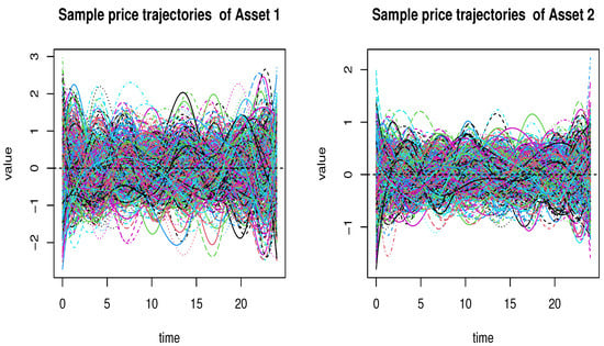 with These operators are considered in order to incorporate the theoretical assumption, namely, the postulate PO1. The generated MFGARCH represents the day-dynamic of portfolios containing two financial assets. The price trajectories of the two assets are plotted in Figure 1.