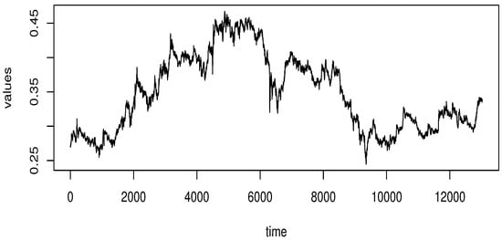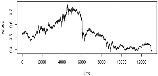 We point out that the local constant is a particular case of the local linear approach. Moreover, it is well documented that the local linear approach reduces the bias term in the local constant one. Thus, our principal purpose in this section is to highlight the superiority of the local linear approach over the local constant approach in financial risk management. Recall that the main feature of the present contribution is the multifunctionality of the data, allowing us to analyze the risk of multiple assets. Thus, we consider the daily price of a portfolio containing high values of three cryptocurrencies: Biconomy, Bitcoin, and BinaryX. The data are available on the website https://stooq.com/db/h/ (accessed on 8 March 2025). We consider the data of weeks (from 18/11/2024 to 08/01/2025) with a frame of 5 mins. In order to examine the main characteristics of financial time series data, including volatility, skewness, kurtosis, and/or normality, we display the initial time series in Figure 3, Figure 4 and Figure 5.
