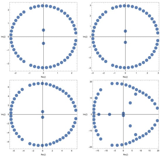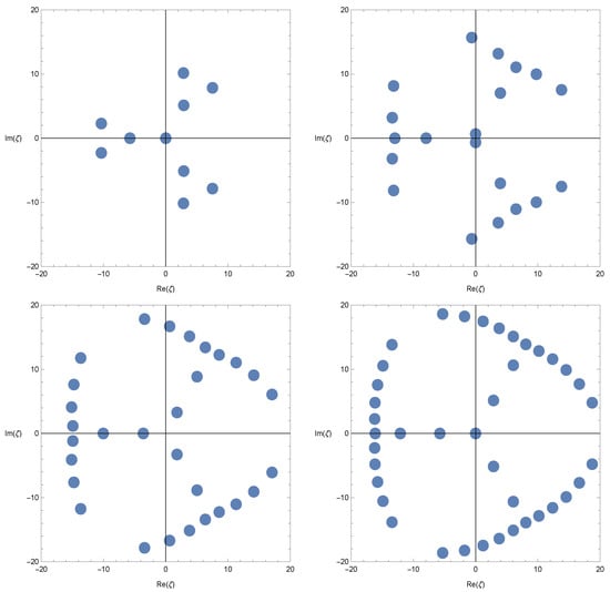 We also investigated the beautiful zeros of the three-variable q-truncated Gould–Hopper polynomials by using a computer. We plotted the zeros of the three-variable q-truncated Gould–Hopper polynomials , for and (Figure 3).