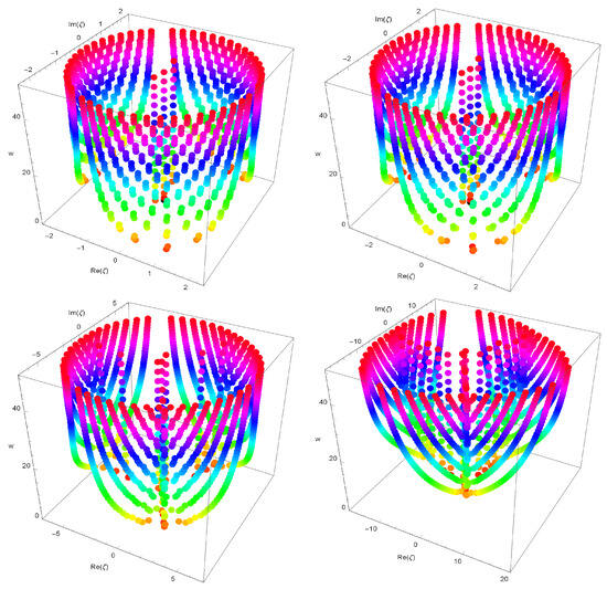 Stacks of zeros of the three variable q-truncated Gould–Hopper polynomials for , forming a 3D structure, are presented (Figure 2).