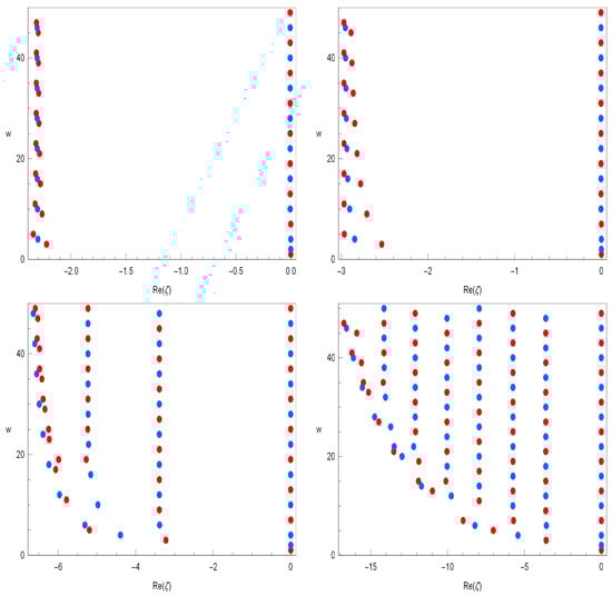 Plots of the real zeros of the three-variable q-truncated Gould–Hopper polynomials for are presented (Figure 4).