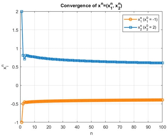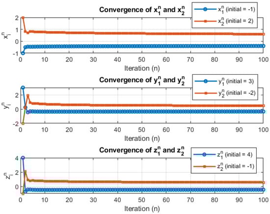Also, it is verified that all conditions of Theorem 2 are satisfied. Clearly, for the sequence converges strongly to the solution of system (41). In this regard the convergence graph (Figure 1) and computational table (Table 1) are shown below. Also, the convergence of each sequence individually involved in Algorithm 1 is shown in Figure 2.