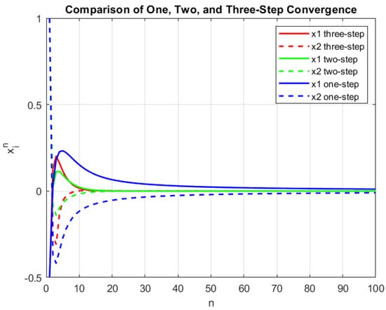 We select identical operators to those in the above numerical illustration and compare our innovative three-step iterative Algorithm 1 against the two-step iterative algorithm (Ishikawa-style) and the one-step iterative algorithm (Mann-style). By setting , we derive the sequences and as detailed below: