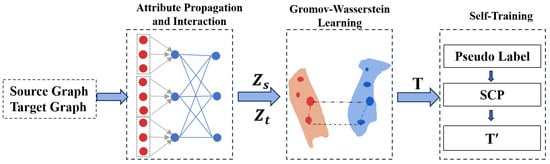 As demonstrated in Figure 1, our model is composed of three major phases. The attribute propagation and interaction phase takes graph structures (i.e., ) and node attributes (i.e., ) as input and computes the node embedding matrix , which is then used to improve the cost computation in the following phase and to enhance model accuracy. The unsupervised Gromov–Wasserstein learning phase utilizes Gromov–Wasserstein distance [] to address the issue of non-comparability arising from inconsistent graph topologies [,]. Both phases are combined to form an end-to-end pipeline that predicts the alignment matrix . Next, the self-training phase is applied to compute a revised prediction  to improve the matching accuracy and it can be applied to other existing OT-based methods (e.g., [,]). The pseudo-code is demonstrated in Algorithm 1, with the details of three phases described in the following subsections. Note that for each node  in the smaller graph , the algorithm returns  with its matched node , where  is the node in  with the largest matching probability .