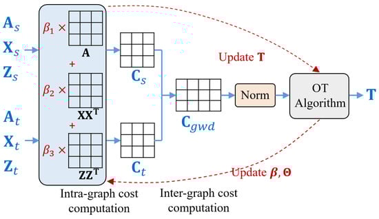 Our cost computation differs from representative GW learning approaches [,] in the following aspects. We provide a more flexible multi-view modeling which enables a full interaction of graph structures and node attributes. Meanwhile, we take a step further to include attribute interaction, enhancing the model’s expressive power.
