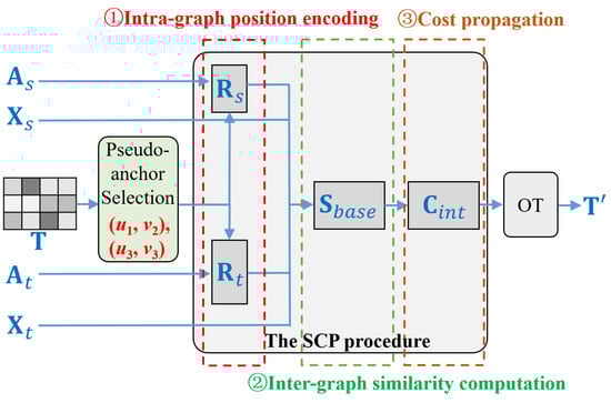 Here,  represents the transition matrix, with  being the diagonal degree matrix. The parameter  is referred to as the teleportation probability [] and  is a one-hot vector with the -th (resp. -th) component to be 1. By concatenating all the vectors to get the -sized  and the -sized , each node in  and  obtains a q-dimensional positional embedding. Then, the inter-graph cost matrix  is computed by a two-step procedure: